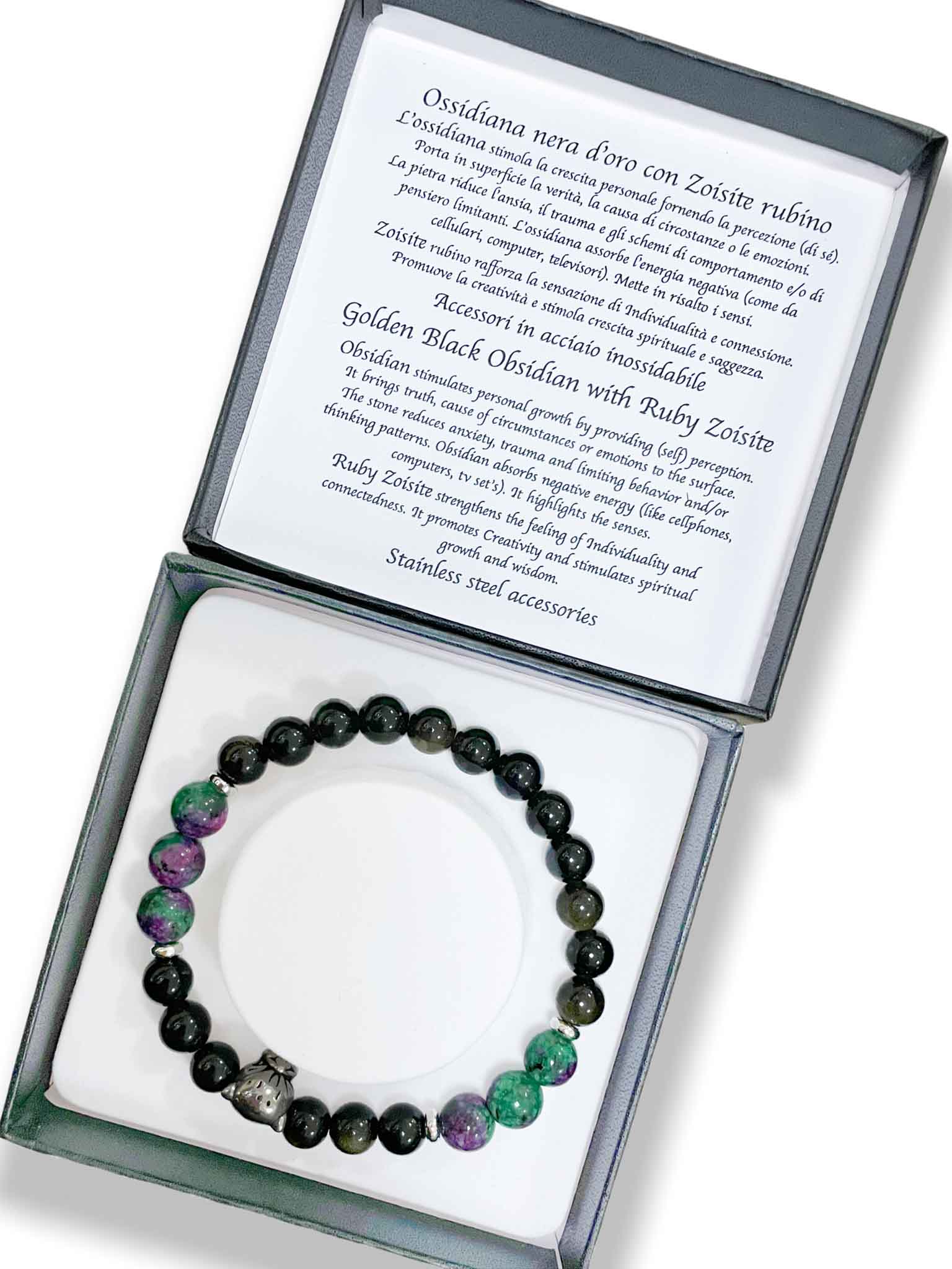 BRACCIALE OSSIDIANA NERA D'ORO CON ZOISITE RUBINO